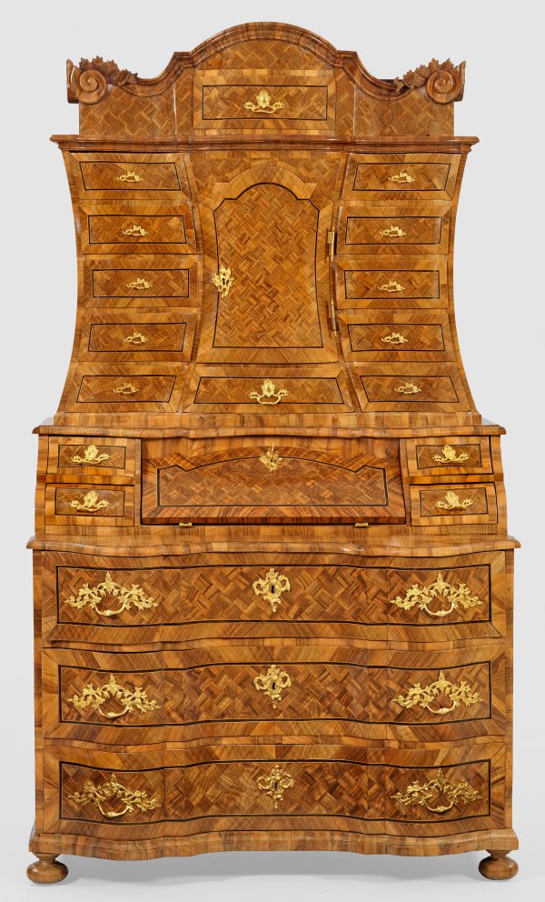 Nussbaum, furniert. Gerader, querrechteckig angelegter Korpus auf schmaler Profilzarge und gedrückten Füßen. In der gegliederten Front drei breite, gegenläufig geschweifte Schubladen. Korrespondierende Auflage für schräggestellte, abklappbare Arbeitsfläche, flankiert von bombierten Schubladen. Oberhalb seitlich konkav eingezogener Aufsatz mit zentraler Tabernakeltür, umgeben von diversen Schubladen. Zentralverriegelung. Geschweift ansteigendes, mittig hoch aufgeworfenes Profilgesims mit kräftigen Volutenmotiven in den Ecken. Im oberen Abschluss zwei Ablagefächer. Flächendeckend breit gerahmte Furnierfelder aus Rautenmarketerie, begrenzt von schmalen Bandeinlagen. H. 224 cm. 127 cm x 72 cm.
