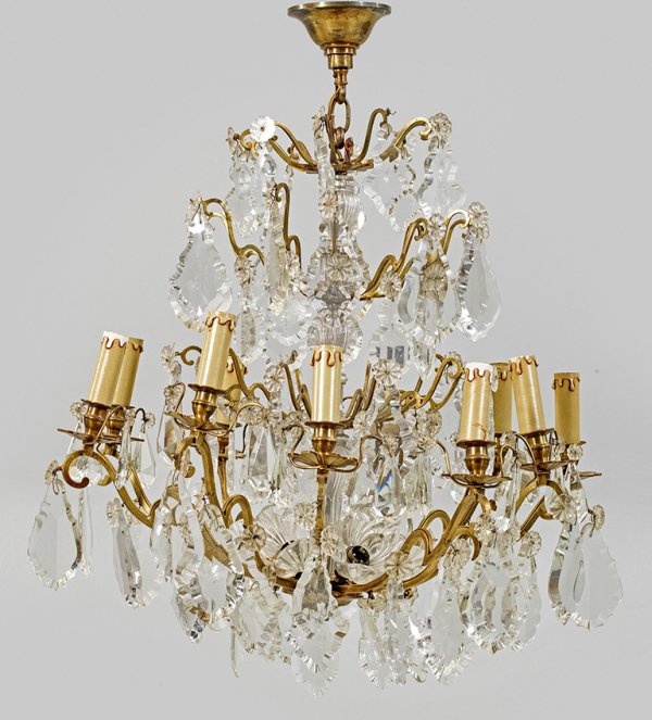 10-flg.; Messing und farbloses Kristallglas. Mehrfach gegliederter Balusterschaft. Davon ausgehend stark geschwungene Leuchterarme mit vasenförmigen Tüllen sowie oberhalb korrespondierende Streben. Üppiger Behang aus großen unterschiedlichen Prismen. Innen fünf blütenförmige Lampenfassungen. Elektrifiziert. Unw. besch.; H. 77 cm. D. 60 cm.