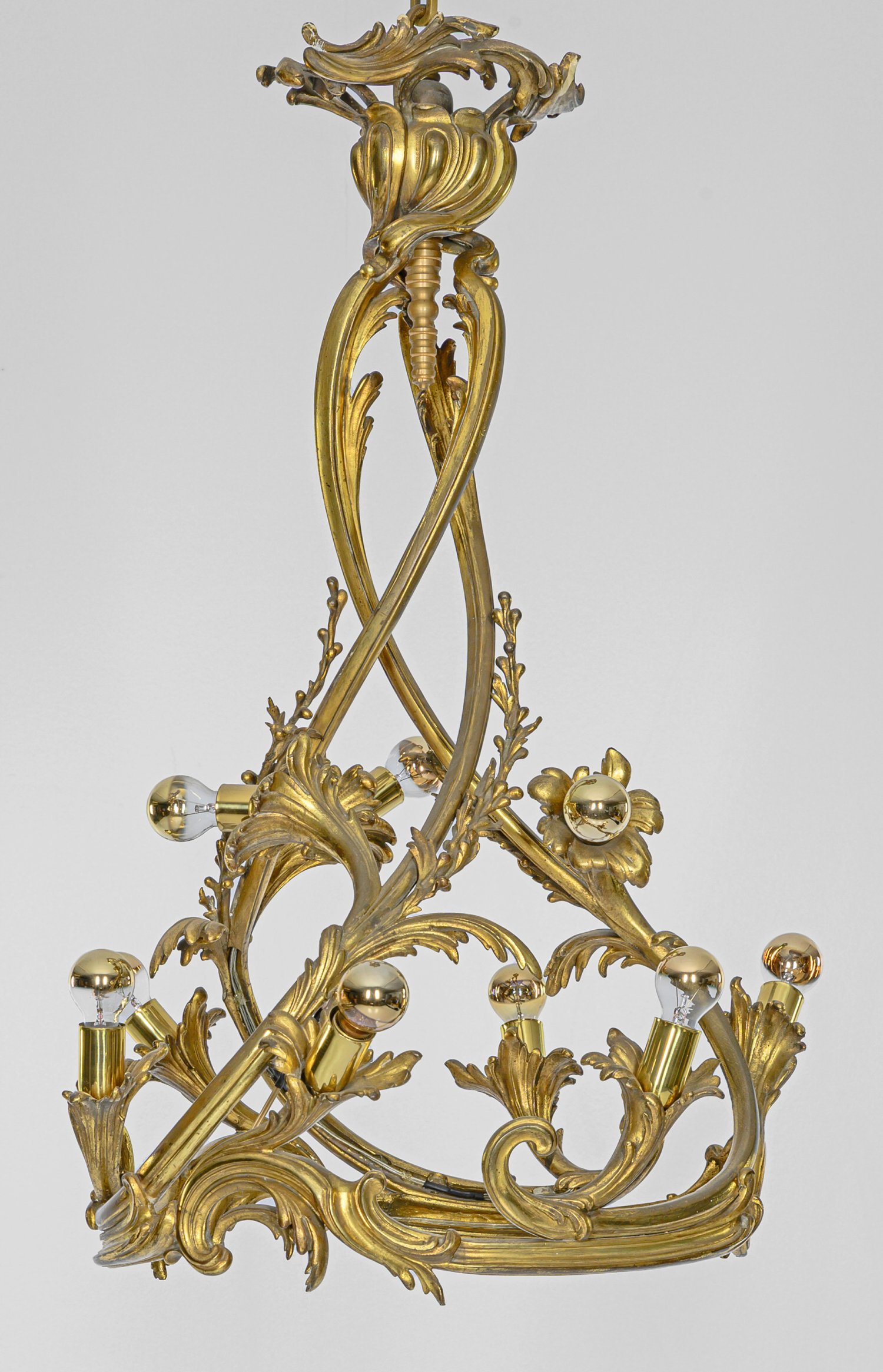 9-flg.; Bronze. Offen gestalteter Korpus aus stark geschwungenen Blattranken als Träger für gestuft angeordnete Leuchtmittel. Elektrifizierung unvollständig. H. 85 cm. D. 57 cm.