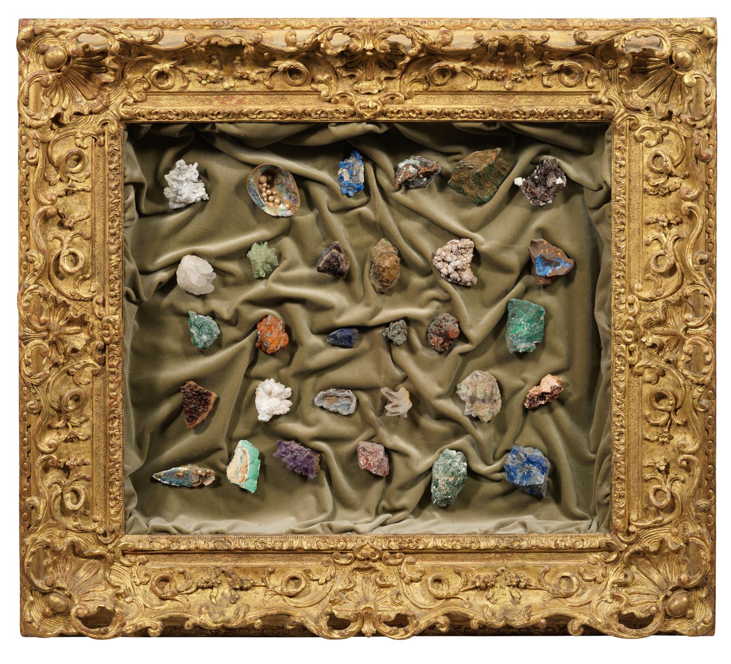 Schwerer, ornamental gearbeiteter vergoldeter Rahmen mit olivgrün ausgeschlagener Stoffverkleidung. Darauf verschiedene, frei arrangierte Steine- und Mineralien. Darunter wohl Eisenkiesel, Bergkristalle, Lapislazuli und Fuchsit. 105 cm x 97 cm.
