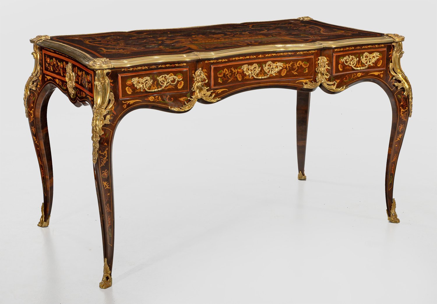 Nussbaum, furniert sowie Einlagen aus unterschiedlichen, teilw. gefärbten Edelhölzern. Passig geschweifter Zargenkasten auf geschwungenen Beinen. In der gegliederten Front drei Schubladen unterschiedlicher Größe. Korrespondierende, profilgerahmte Deckplatte mit intarsiertem Blütenkorb, umgeben von üppigen Volutenmotiven. Allseitig korrespondierende Furnierfelder. Applikationen aus vergoldeter Bronze. H. 82 cm. 140 cm x 75 cm.