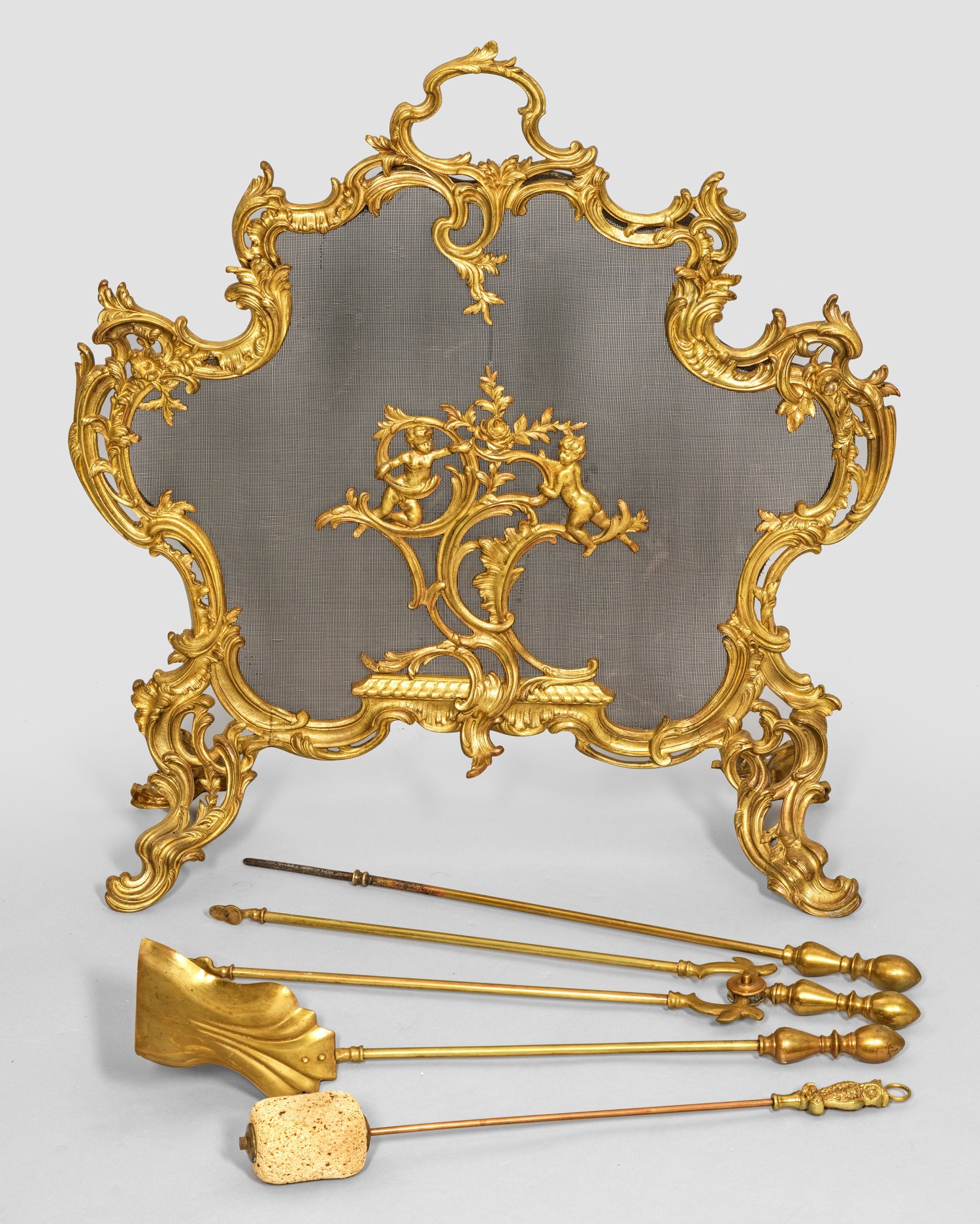 5-tlg.; Kaminschirm und Kaminbesteck. Messing. Kartuschenförmige Rahmung aus üppigen Rocaillen für feinmaschiges Metallgitter auf Volutenfüßen. In der Mitte durchbrochen gearbeitete Rocaille mit Putten. Zange, Aschenschaufel und Schürbesteck mit Balustergriffen. Gitter-H. 78 cm x 73 cm.