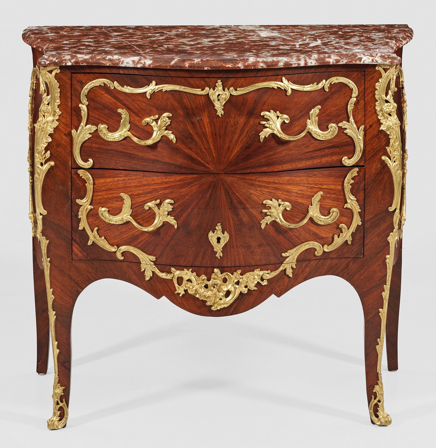 Nussbaum, furniert. Dreiseitig bombierter Korpus, flankiert von schmalen Ecklisenen, in hohe, leicht ausgestellte Beine übergehend. In der gegliederten Front zwei optisch verbundene Schubladen sans traverse. Zentriert bzw. gespiegelt angeordnete Furnierfelder. Reiche Applikationen aus vergoldeter Bronze. Profilierte Deckplatte aus rot-weiß gemasertem Marmor. H. 89 cm. 98 cm x 48 cm.