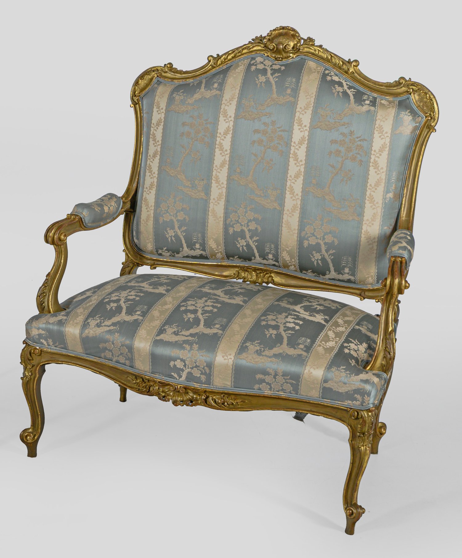 Holz, geschnitzt, gefasst und vergoldet. Schmale, passig geschweifte Zarge auf geschwungenen Volutenbeinen. Korrespondierende Stützen für schmale Armlehnen. Breite, mittig hoch aufgeworfene Rückenlehnenrahmung mit Rocaillebekrönung. Gepolstert und bezogen. H. 114 cm. 96 cm x 60 cm. Sitz-H. 44 cm.