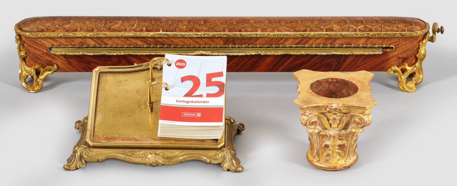 Rosenholz, furniert sowie Applikationen aus Bronze. Gestreckter Korpus auf durchbrochen gearbeiteten Rocaillefüßen. Ausziehbare Arbeitsfläche aus türkisgrünem Stoff. L. 61 cm. Dazu Kalenderhalterung aus Messing sowie Podestsockel aus vergoldetem Stuck.