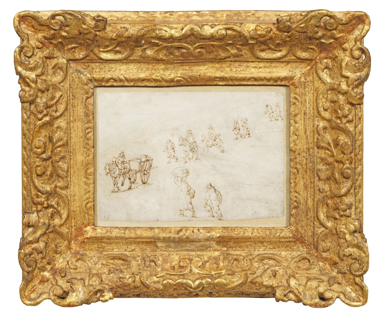 Mit sicherer Hand ausgeführtes, detailgenaues Studienblatt, das zahlreiche Figuren, teilweise auf Pferden reitend und mit Warenkörben beladen und einen Lastkarren schildert. Der Fokus scheint hierbei auf die Bewegung, den Gang bzw. Trab (Pferde) gelegt worden zu sein. Der Gesamtstil der Arbeit entspricht nachweislich vergleichbaren Blättern Jan Brueghels d. Ä., analoge Sujets und Kompositionen finden sich auf Sammlungsexponaten der Albertina in Wien (Inv.-Nr. 8423), des Fitzwilliam Museums in Cambridge (Inv.-Nr. PD.208-1963) oder des Städelmuseums in Frankfurt a. M. (Inv.-Nr. 3781). Die dargestellten Motive sind aber auch in zahlreichen Gemälden Jan Brueghels d. Ä. nachzuweisen, u.a. in "Roadside Chapel on a Hill" (Wvz. Ertz 2008-10, Nr. 32) oder "Woodland Road near a Village" (Wvz. Ertz 2008-10, Nr. 53). Federzeichnung in Braun/Papier (WZ: Wappenschild). L. u. mit Bleistift bez. "25". Verso mit Feder bez. "449" sowie rotes Lacksiegel der Galerie van Diemen & Co., Den Haag. Ca. 14,9 cm x 21,3 cm. Rahmen.