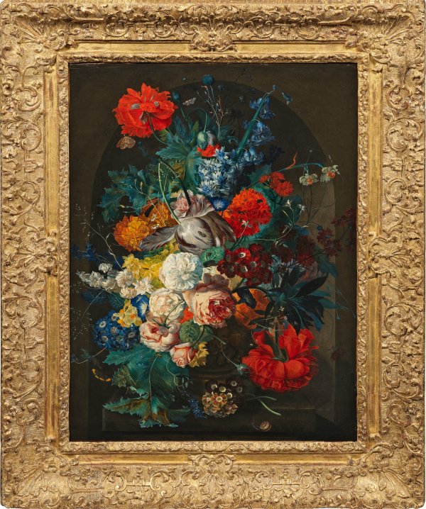 Auf einer steinernen Konsole in Bogennische arrangierter, opulenter Strauß aus verschiedenen duftig und detailreich geschilderten Frühlings- und Sommerblumen, umschwärmt von Insekten wie Bienen, Fliegen, Ameisen, Schmetterlingen sowie Schnecken. Qualitätvolle, fein lasierend ausgeführte Kopie nach dem verschollenen Ölgemälde auf Holztafel von Jan van Huysum aus dem ehemaligen Kaiser-Friedrich-Museum (heute Bodemuseum) in Berlin (Inv.-Nr. 972B). Bereits zu Lebzeiten wurden van Huysums Werke hoch geschätzt, besonders seine prachtvollen, harmonisch komponierten, durch geschickte Lichtführung hervorgehobenen Blumenstücke, die sich durch außerordentliche Feinheit und Naturtreue auszeichneten. Obwohl der Künstler keine direkten Schüler hatte, fand er durch seinen enormen Erfolg zahlreiche Nachfolger und Nachahmer. Öl/Lwd., doubliert; 79,5 cm x 58,5 cm. Rahmen.