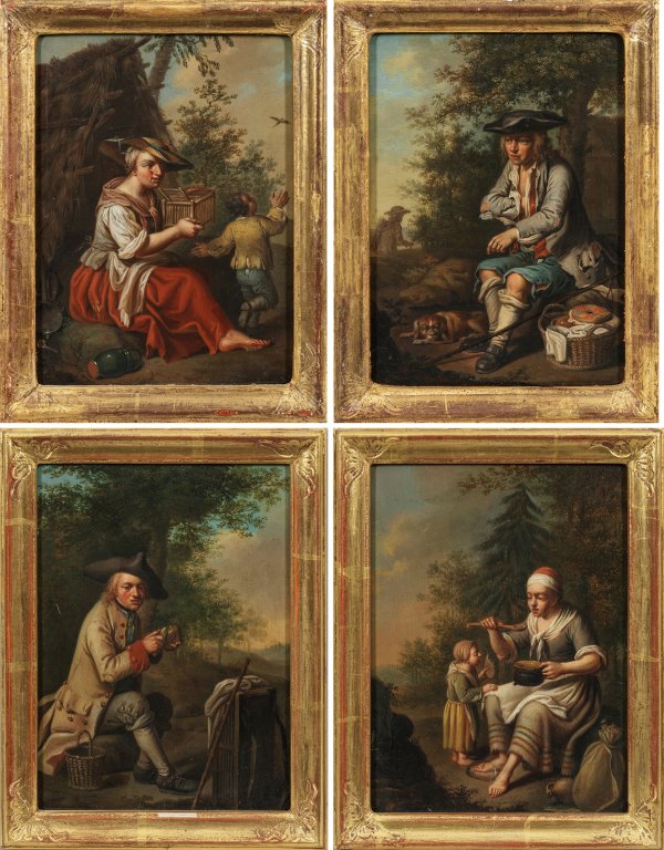 Seltene Serie von vier Kabinettbildern mit ländlichen Figuren