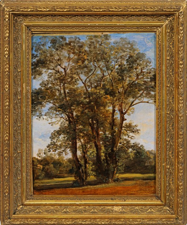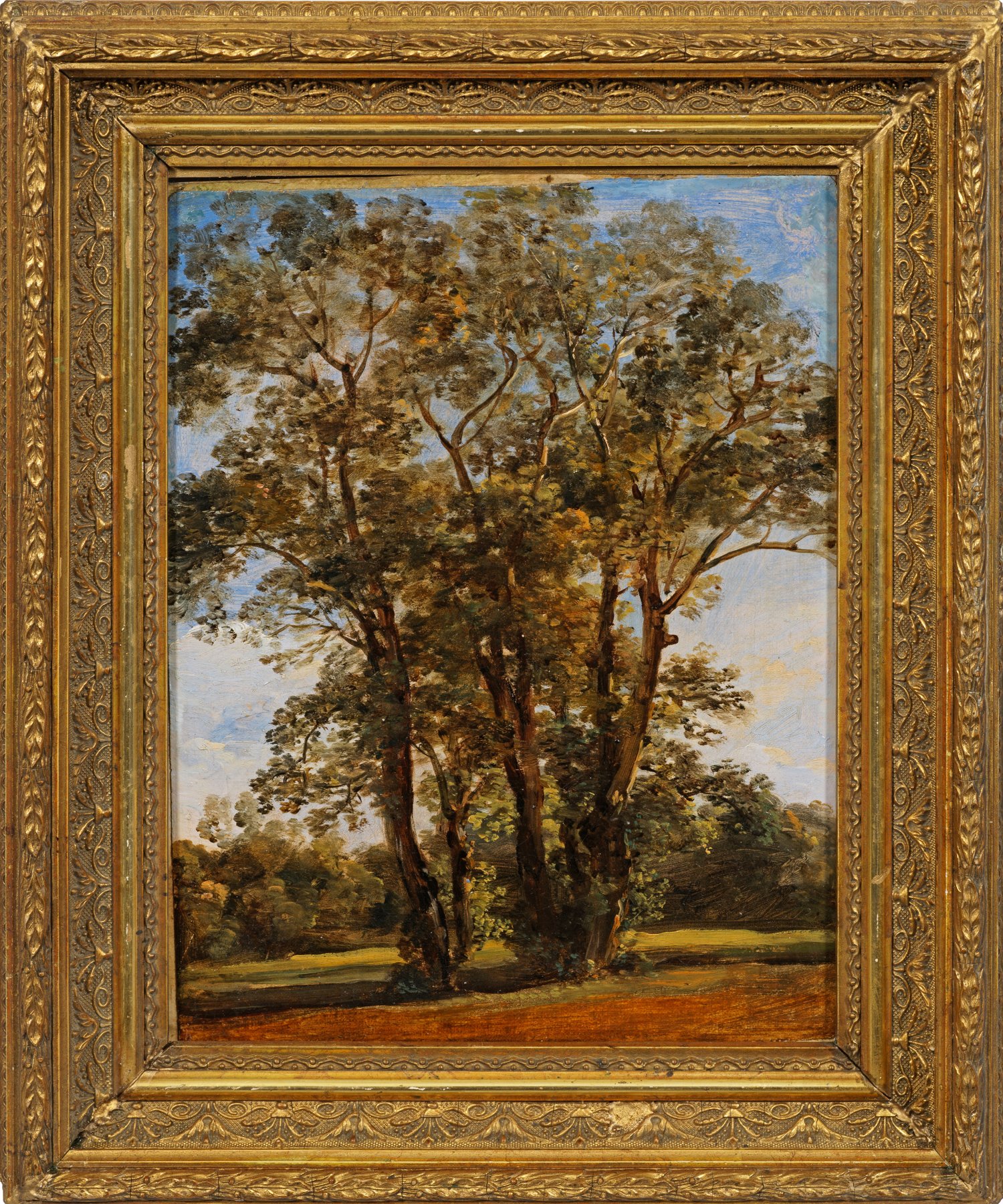 In sommerlicher Lichtbehandlung und heiterer Farbpalette angelegte Naturstudie, die in Stil, Motiv und der trefflichen Schilderung eines unmittelbaren Naturerlebnisses evidente Parallelen zu den Arbeiten Georg von Dillis aufweist. Dieser erhielt seine künstlerische Ausbildung bei Johann Jakob Dorner d. Ä. und an der Akademie in München. Künstlerisch und kunsthistorisch bedeutend ist Dillis als einfühlsamer Porträtist der oberbayerischen Landschaft mit dem Münchener Umland sowie Tirol. Öl/Lwd., kaschiert auf Karton. Verso handschriftliches Gutachten von Eberhard Hanfstaengl, München 1923. 25,5 cm x 19 cm. Rahmen.