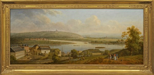 Große, trotz der Wirklichkeitsnähe zwecks Steigerung der Erhabenheit, leicht idealisierte Panorama-Landschaft. Schneider wählte für sein beeindruckendes Hauptwerk den Blick von einem erhöhten Standpunkt von der Mainzer Seite aus nach Osten. Im Mittelgrund links zeigt er das Dorf Kostheim, rechts Gustavsburg, mittig im Hintergrund auf einem darüber liegenden, leicht idealisierten, erhabenen Hügel die damals noch kleine Ortschaft Hochheim am Main. Im linken unteren Bildvordergrund schloss Schneider die Komposition durch einige Häuser eines Mainzer Eckviertels und einen Teil der Mainzer Stadtbefestigung ab. Belebt wird die Vedute durch zahlreiche Figuren im Vordergrund, außer eine flanierende, elegante Familie gehören hierzu mehrere Wäscherinnen, unterschiedliche Bewohner sowie Schiffer in kleinen Ruderbooten und Schiffen. Das Gemälde dürfte wohl um 1785-1790 noch vor der Belagerung von Mainz 1793 mit seinen katastrophalen Zerstörungen entstanden sein. Der fast zeitlebens in Mainz lebende und arbeitende Porträt-, Landschafts- und Vedutenmaler erhielt seine künstlerische Ausbildung bei Franz Joseph Ignaz Anton Heideloff am Hof des kunstsinnigen, sowohl Pracht als auch Wissenschaft liebenden Mainzer Kurfürsten Erzbischof Friedrich Karl Joseph Reichsgraf von Erthal (1719 - 1802, regierend seit 1774). Innerhalb weniger Jahre erlangte er die Anerkennung des Hofes, des Adels und der aufstrebenden Bürgerschaft. 1779 machte sich Schneider zunächst als Porträtmaler selbstständig, um 1785 wandte er sich dann Landschaften am Rhein und Main sowie Veduten von Mainz und Umgebung als Hauptsujet zu. In der Zeit der französischen Besatzung kamen zu seinen Mainzer Auftraggebern auch französische Interessenten hinzu, darunter Mitglieder des französischen Kaiserhauses. Das Motiv und das große, repräsentative Format des vorliegenden Gemäldes lassen auf einen Auftrag einer hochstehenden oder vermögenden Mainzer Persönlichkeit schließen wie den Kurfürsten oder auch den Kunstsammler, Domkapitular und Landschaftsmaler Franz Ludwig Reichsgraf von Kesselstatt (1753 - 1841). Schneider beeinflusste Kesselstatt auch in dessen eigenen Gemälden und als Johann Wolfgang von Goethe 1814/15 zusammen mit dem befreunden Sulpiz Boisserée die Rhein- und Maingegend besuchte, erfreuten ihn auch die Gemälde Schneiders in der Sammlung Kesselstatts. Öl/Lwd.; 74 cm x 171 cm. Rahmen.