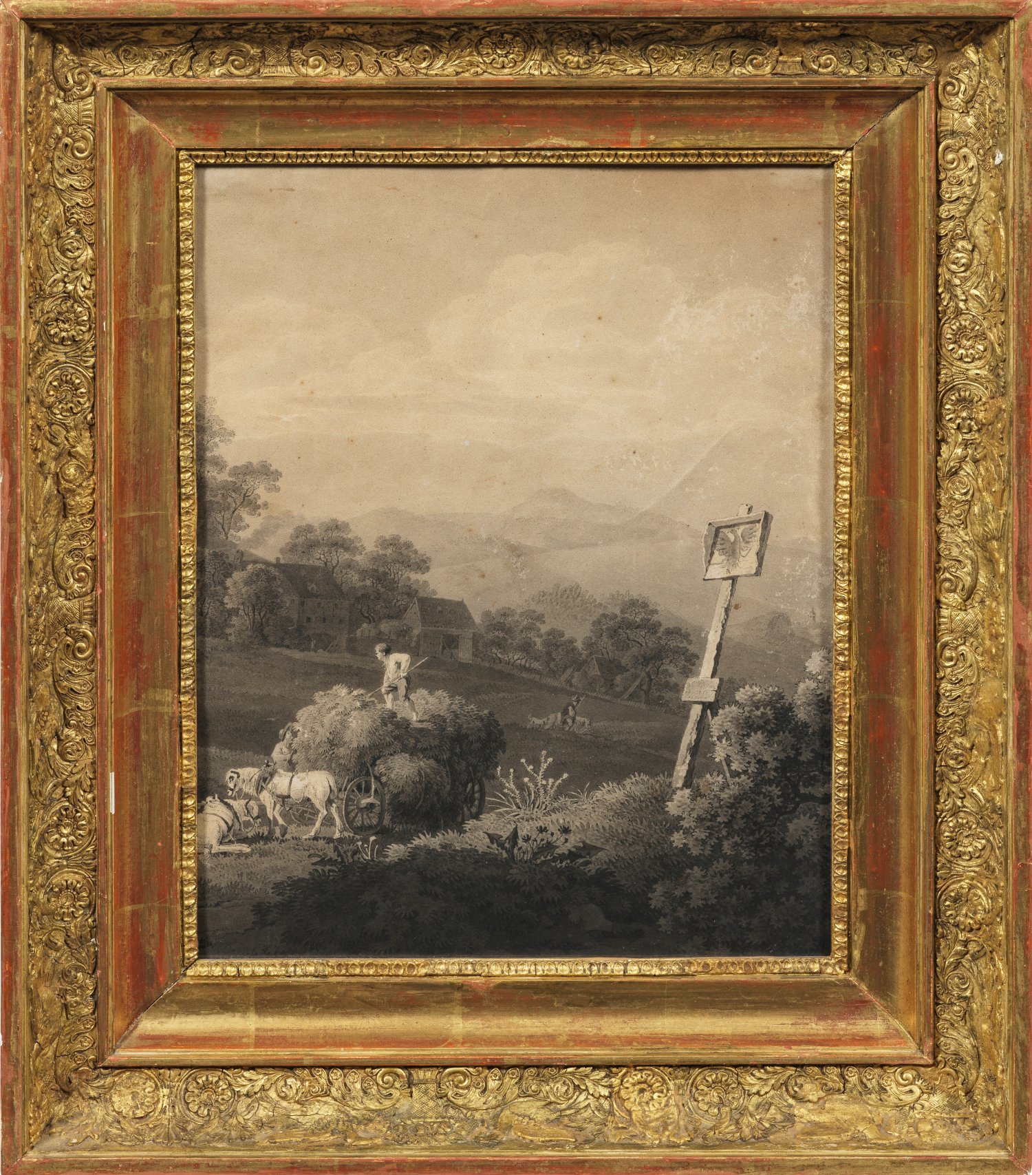Wohl um 1790 ausgeführte, reizvolle Landschaftsvedute mit deutlichen Parallelen in Stil und Motiv zum Oeuvre Adrian Zinggs, der seine Motive vornehmlich im Thüringer Wald, Teilen von Böhmen und in der Sächsischen Schweiz fand, die er zusammen mit seinem Freund, dem Maler Anton Graff, in den 1780er und 1790er durchwanderte. Ausgebildet als Kupferstecher bei seinem Vater sowie in Zürich und Paris lehrte der Künstler ab 1764 an der Dresdner Akademie und pflegte engen Kontakt zu Christian Wilhelm Ernst Dietrich, dessen druckgrafisches Spätwerk er nach Dietrichs Tod vollendete und publizierte. Lavierte Federzeichnung in Sepia mit Weißhöhung/Papier. Auf dem Schild unleserlich bez.; Verso handschriftliche Künstlerzuschreibung auf altem Papieretikett. 27,7 cm x 35,9 cm. Rahmen.