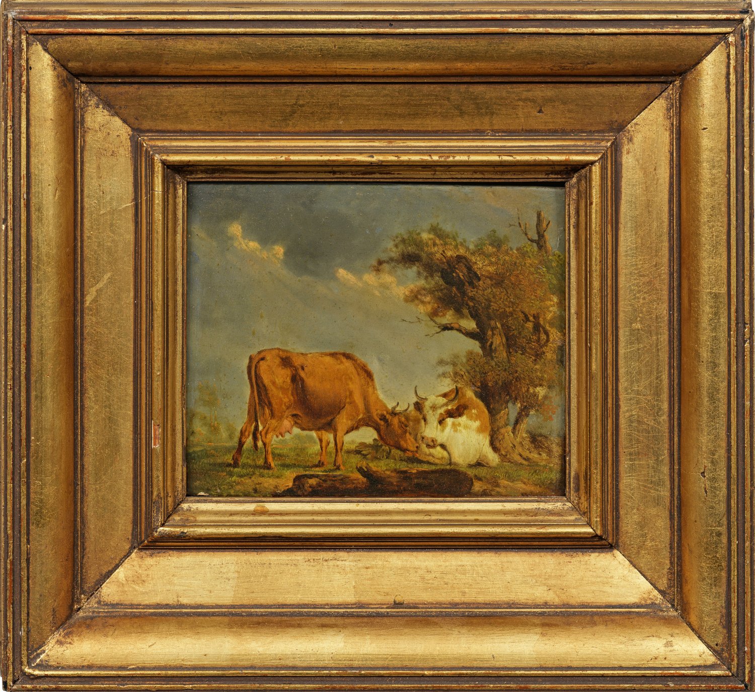 Motiv- und stiltypisches Werk des auf lebendige Darstellungen ländlicher Tiere, insbesondere Weidevieh, spezialisierten Künstlers, der wesentlich durch Paulus Potter beeinflusst wurde. Öl/Eichenholztafel. Verso alte, handschriftliche Künstlerzuschreibung. 15 cm x 19 cm. Rahmen.