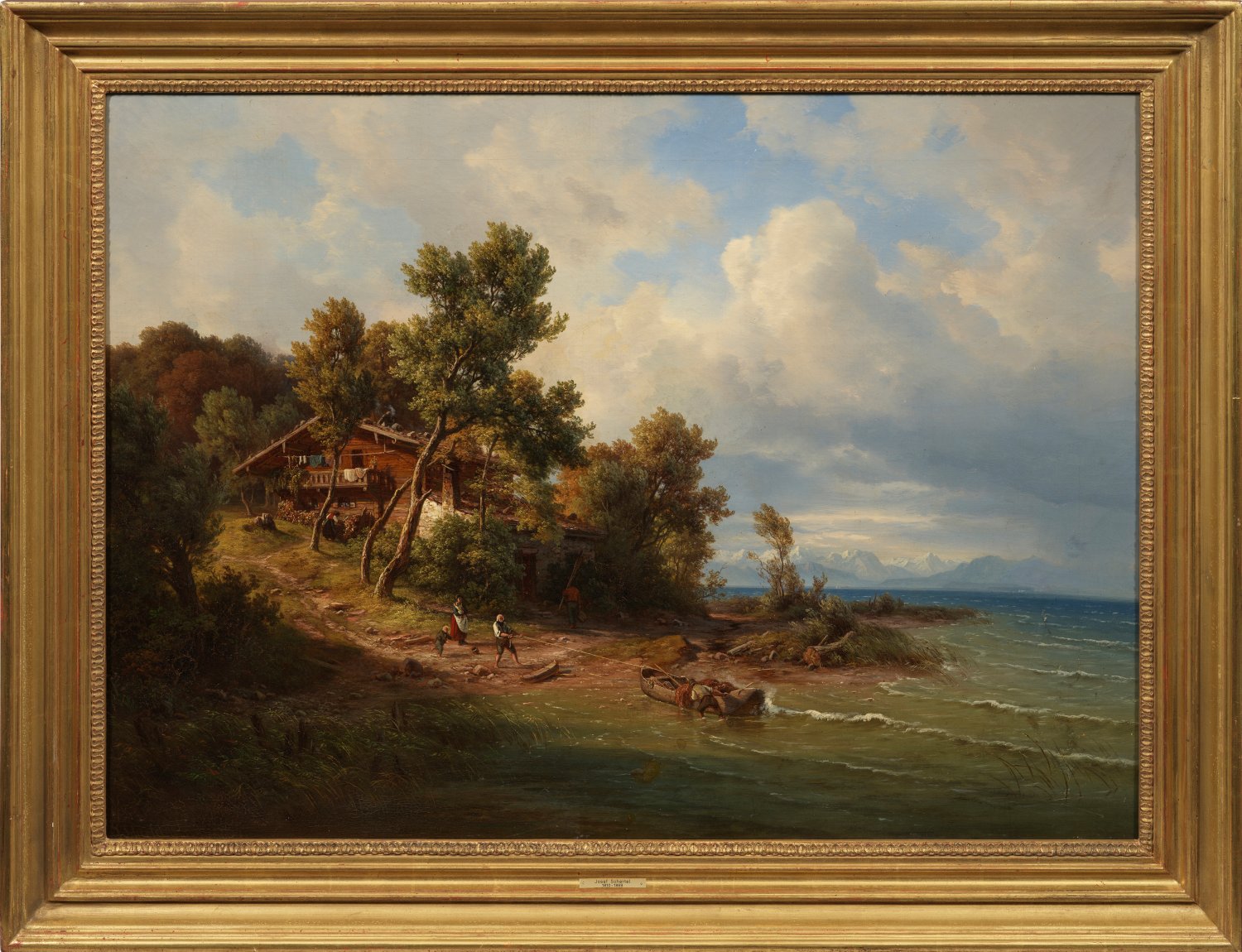 Erzählerisch angelegte, stimmungsvolle Landschaftsimpression, in der das mit dem Tagesfang beladene Boot von zwei Fischern an Land gezogen wird, beobachtet von einer Mutter mit ihrem Kleinkind. Dahinter ein pittoreskes Bauernhaus, eingebettet zwischen üppigen Bäumen und Sträuchern. Über dem tiefblauen Wasser im Hintergrund erhebt sich das beeindruckende Panorama der verschneiten Alpen. Die gebeugten Zweige der Bäume, die rasch aufziehenden, dunklen Wolken und die von Schaum bekrönten Wellen des Wassers künden von einem aufziehenden Unwetter. Feinmalerisch und subtil geschildertes, charakteristisches Werk Schertels, der zunächst eine Lehre als Lithograph absolvierte und anschließend die Historienklasse an der Münchener Akademie besuchte. Ansässig ebenda widmete er sich der Landschaftsmalerei, seine Motive fand er vornehmlich in der oberbayerischen Landschaft um München und im voralpenländischen Umland. Inspiration und Anregungen erhielt er von seinem Lehrer und langjährigen Freund Christian Ernst Bernhard Morgenstern. Öl/Lwd.; L. u. sign. mit Ortsangabe München u. dat. 1849. 68 cm x 96 cm. Rahmen.