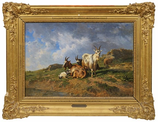 Unter teils dichter und grauer Wolkendecke rastende Ziegen und Schafe auf einer hügeligen Weide, die an einer Wasserstelle liegt. Fein nuanciertes, in eindrucksvollem Licht- und Farbspiel gemaltes Tierstück Humberts, der Schüler von Joseph Hornung war und sich im Atelier von Jean-Auguste-Dominique Ingres in Paris weiterbildete. Zusammen mit seinen Malerkollegen Alexandre Calame und François Diday unternahm er Studienreisen in die Alpen und schuf überwiegend Landschaften und Tierbilder, wobei er eine besondere Passion in der lebendigen Darstellung von Weidevieh entwickelte. Öl/Lwd.; R. u. sign. u. dat. 1853. 48,5 cm x 70,5 cm. Rahmen.
