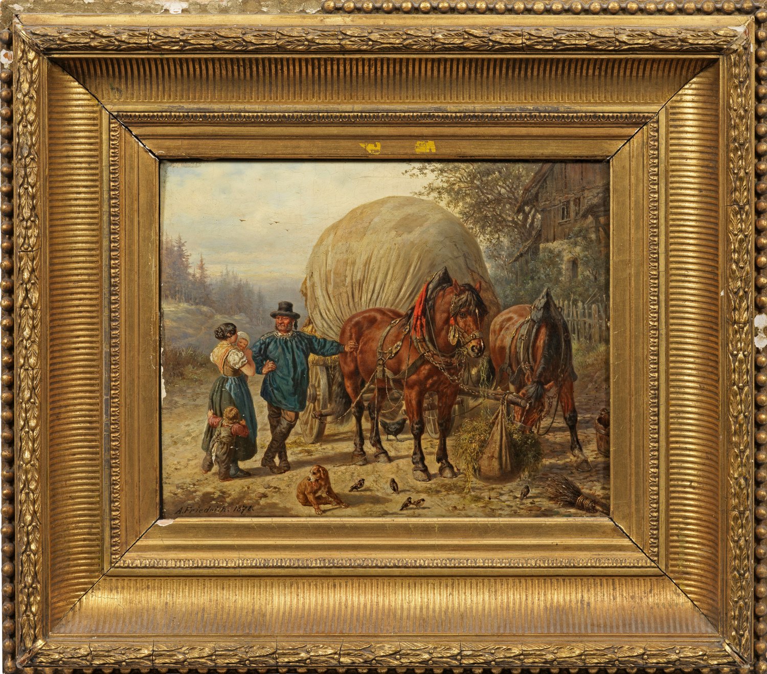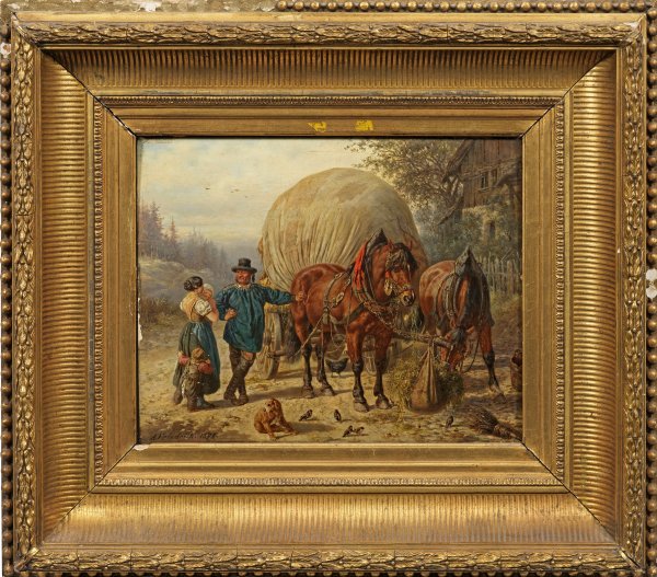 Auf dem Feldweg vor dem Gehöft steht der Bauer an seinen voll beladenen Heuwagen gelehnt und wird von seiner Frau mit den beiden kleinen Kindern begrüßt. Die noch eingespannten Ackergäule laben sich bereits am frischen Heu, während eine Vogelschar die auf den Boden fallenden Reste aufpicken. Fein gemaltes, charakteristisches Werk Friedrichs, der als Sohn Caspar David Friedrichs ebenfalls die künstlerische Laufbahn einschlug und ab 1840 die Dresdener Akademie besuchte. Ab 1857 wandte er sich mit großer Hingabe dem Studium der Pferde zu. In überaus lebendigen Darstellungen dieser Tiere wurde er rasch zu einem Meister, sodass seine Bilder auch im Ausland Liebhaber fanden. Öl/Holztafel. L. u. sign. u. dat. 1871. 29 cm x 36,3 cm. Rahmen.