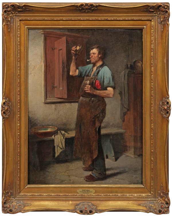 In einer einfachen Stube mit Sitzbank, Waschschüssel und Schrank steht ein Handwerker mit speckiger Lederschürze und Pfeife und wirft einen prüfenden Blick auf den verbliebenen Rest in der Schnapsflasche, für den er in seiner linken Hand ein Glas bereithält. Feinmalerisch und in fein nuanciertem, erdigem Kolorit ausgeführte Genreszene Lübens, der seine künstlerische Ausbildung 1853 in Berlin begann und anschließend ab 1860 in Antwerpen fortsetzte. Zuerst in Berlin tätig, wurde der Genremaler ab 1876 in München ansässig. Öl/Lwd.; L. u. sign. Verso Etikett des Norddeutschen Gesamt-Kunstvereins "NDGKV No. 51". 55,5 cm x 40 cm. Rahmen.