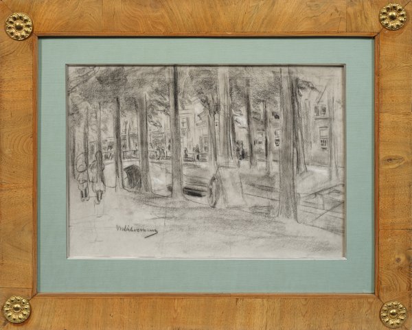 Blick auf die Geerbrug oder Koenebrug über die 1935 zugeschüttete Levendaal-Gracht (in Höhe der Geregracht) nach Westen. Eine große Anzahl der malerischen Hauptwerke, Zeichnungen und Grafiken Liebermanns stellt Motive aus Holland dar. Das relativ große Blatt zeigt eindringlich, wie Liebermann als der große Impressionist, in subtiler Weise die Licht- und Schattenwirkungen an der von Bäumen flankierten Gracht in Alt-Leiden faszinierten, die durch Figuren wie die beiden Mädchen im Vordergund belebt wird. Seit seiner ersten Reise 1871 in die Niederlande, nach Amsterdam und Scheveningen, faszinierte ihn das Land, seine Menschen, die Landschaft und Städte. Seitdem folgten bis 1913 zahlreiche Reisen, oft mehrmonatige Studienaufenthalte und später auch regelmäßige Sommerreisen mit der Familie in die Niederlande. Die Zeichnung spiegelt zugleich die zwei Seelen Liebermanns wider, der als Bürger in Berlin, als Maler jedoch in Holland lebte. Erst in Holland fand er im Umfeld der "Haager Schule" eine freie Erfassung der Landschaft. Mehrfach besuchte er offenbar auch Leiden, wie u. a. seine Gemälde vom "Stevensstift" von 1889/90, "Oude Vinck" von 1905 und der "Biergarten in Leiden (Zelten)" aus dem Jahr 1900 belegen. Liebermann war 1892 in Berlin Mitbegründer der "Vereinigung der XI", aus der 1898 die "Berliner Secession" hervorging, in der er eine führende Position übernahm. Nach dem I. Weltkrieg fungierte Liebermann 1920-1932 als Präsident, dann 1932-1933 als Ehrenpräsident der Preußischen Akademie der Künste in Berlin. Schwarze Keide mit Weißhöhungen, L. u. sign.; Blatt 34,7 cm x 49,7 cm. Rahmen.