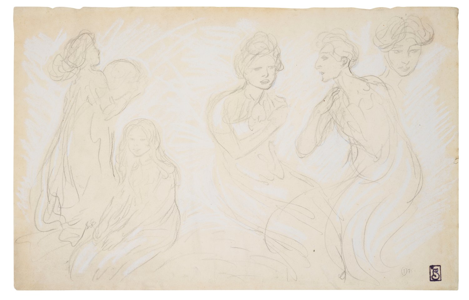 Gekonnt flüchtig skizzierte Schilderung fünf junger Frauen in teils bewegten Haltungen. Rückseitig weitere Figurenstudien mit einem bärtigen, stehenden Mann und angedeuteten weiblichen Akten. Steinlen, der sich einen Namen als Maler, Zeichner, Karikaturist, Illustrator und Plakatkünstler machte, ging 1878 nach Paris und avancierte dort rasch zu den wichtigsten Künstlern des Montmartre. Er gehörte zu den Stammgästen des legendären Kabaretts "Le Chat Noir", für das er Plakate schuf und wo er u. a. Aristide Bruant, Henri Toulouse-Lautrec und Félix Vallotton kennenlernte. Zu seinem Freundeskreis zählten überdies Schriftsteller wie Emile Zola und Anatole France. Ab 1893 präsentierte er seine Werke im Salon des Indépendants, 1903 beteiligte sich Steinlen mit über 150 Werken an der Berliner Sezessionsausstellung. Deckweiß und Bleistift/Papier. Monogrammstempel. Teils wohl von fremder Hand bez.; 32 cm x 50,5 cm.