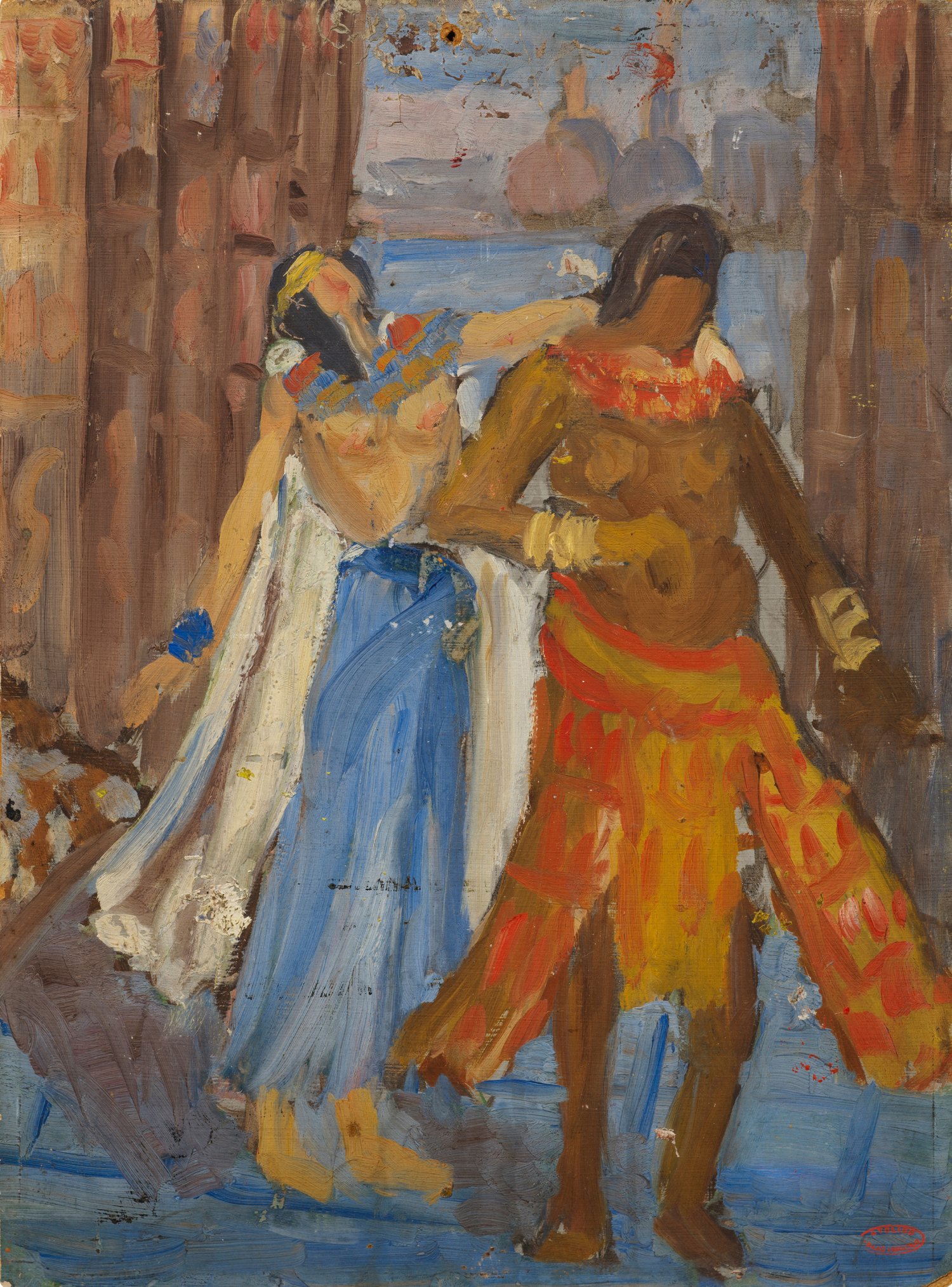 Attributed to Isaac Israëls. Oil on cardbord. Red oval estate stamp "ATELIER ISAAC ISRAELS" lower (Lugt 1402a) lower right. Old artist's suppliers label by Sennelier, Paris. One hole to the upper edge. Provenance: privatee collection, Germany. According to information from the heir acquired by the grandfather from a private collection in The Hague in the late 1950s.