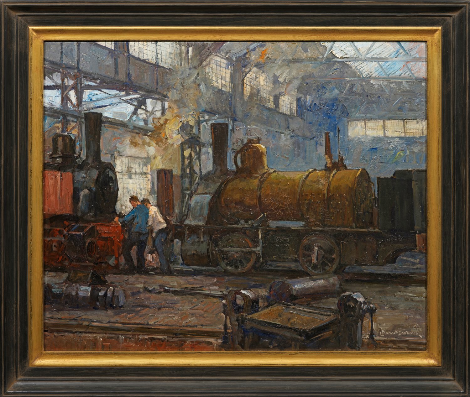 Blick in eine stählerne, verglaste Halle, durch die sich Rauch- oder Dampfschwaden ziehen, darin zwei alte Lokomotiven und Arbeiter bei der Reparatur. Mit breitem, kraftvollem Duktus gemaltes Werk des Impressionisten, wohl aus dessen bedeutendster Schaffensperiode um 1910-1920. Das großstädtische Berlin und die Industrialisierung faszinierten Sandrock seit 1910 besonders: Hafen-, Fabrik-, Stahlwerk- und Eisenbahndarstellungen mit Lokomotiven wurden Schwerpunkte seines Oeuvres. Hierbei hielt er auch die einzelnen Arbeitsabläufe in Verbindung mit den tätigen Menschen fest und fing die faszinierenden Lichteffekte ein. Der von Hermann Eschke ausgebildete Sandrock beteiligte sich seit 1898 alljährlich an der Großen Berliner Kunstausstellung. 1912 zeigt er dort das im Motiv und Stil vergleichbare Gemälde "Lokomotivschuppen". Max Osborn rühmte Sandrock 1912 als "eines der stärksten und hoffnungsvollsten Talente der Berliner Malerzunft" und dessen furiosen Stil. Öl/Lwd.; R. u. sign.; Original-Etikett mit eigenhändiger Künstler-Bez., Betitelung u. Berliner Adresse Sandrocks; modernes Etikett mit Nachtrags-Nr. "NG 143" zum Werkverzeichnis der Gemälde. 72 cm x 90,5 cm. Rahmen.