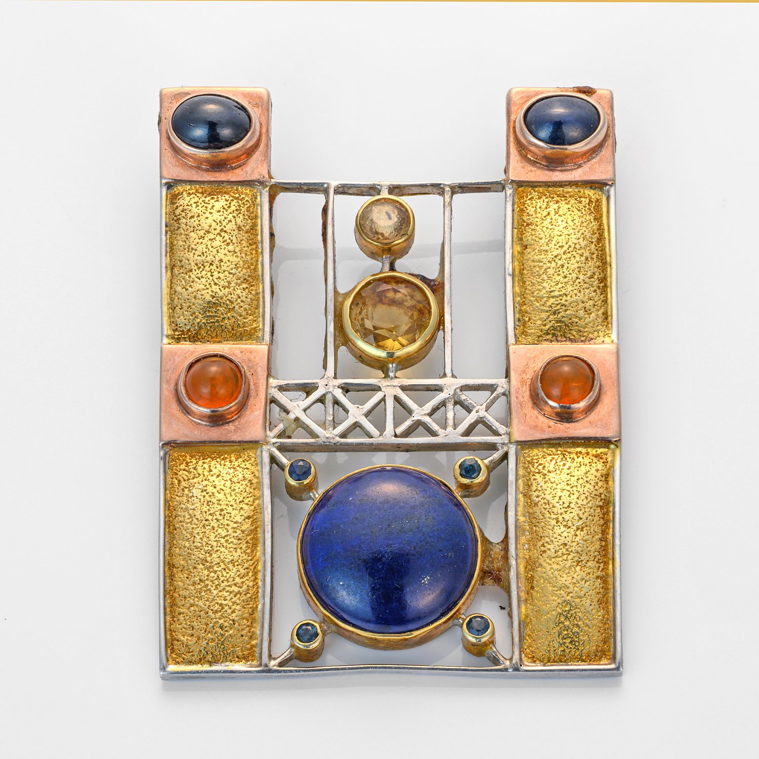 Silber, teilw. goldberieben, gest. 925. Geometrisch und durchbrochen gearbeitet, besetzt mit Lapislazuli-, Citrin- und Feueropal-Cabochons im Stil von Josef Hoffmann, Wiener-Werkstätten. 43 mm x 60 mm. Gew. ca. 21,8 g.