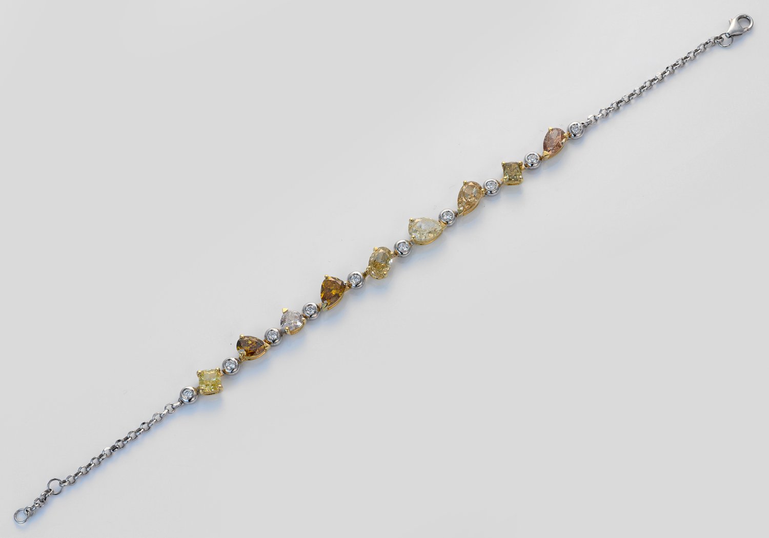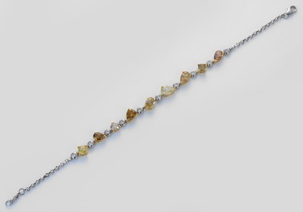 Bracelet set with fancy diamonds approx. 5,50 ct. and white diamonds approx. 0,25 ct., in 18 k white gold.