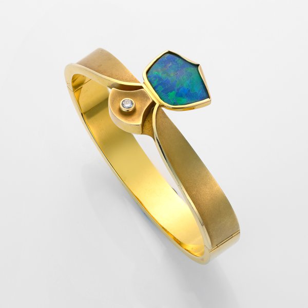 Gelbgold, gest. 585. Leicht verlaufender, schauseitig satinierter Reif, mittig Kristallopal in sehr feinem opalisierenden Farbspiel, bekrönt von Brillant-Solitär von ca. 0,17 ct. (F-G/if). Gew. ca. 41,96 g. Sehr schöne Goldschmiedeausführung.