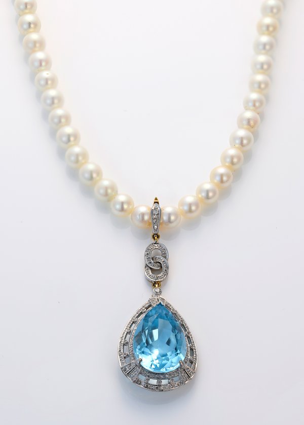 Gelb- und Weißgold, 18 ct.; Einreihige Kette aus schneeweißen Zuchtperlen von ca. 6,5 mm in sehr feinem, rosé-grün changierendem Lüster. Zentraler Anhänger mit einem Topas von ca. 21 mm x 16 mm x 11 mm im Pendeloqueschliff, entouriert von kleinen Diamanten. Gew. ca. 39,41 g.
