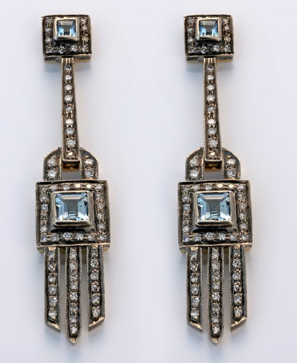 Pair of earrings set with ice blue aquamarines approx. 1,40 ct. and diamonds approx. 1,75 ct., in silver and 14 k gold.