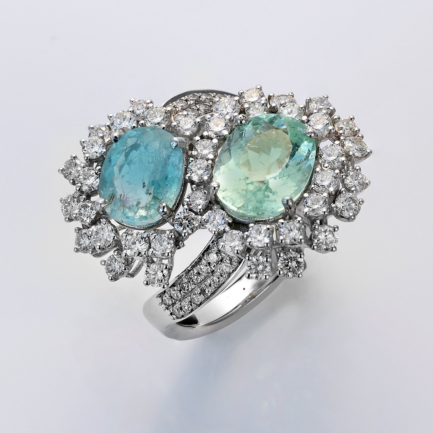 Weißgold, gest. 750. Diagonal versetzt besetzt mit 2 blaugrünen Turmalinen von 2,52 ct. und 3,42 ct. im Ovalschliff, entouriert von Brillanten von zus. ca. 2,26 ct., Gew. ca. 11,54 g.