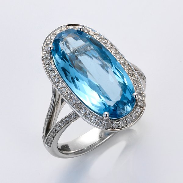 Weißgold, gest. 750. Zentral besetzt mit einem nahezu Santa Maria-farbenem Aquamarin von ca. 9,16 ct., entouriert von Brillanten von zus. ca. 0,55 ct. (F-G/si). Gew. ca. 9,32 g.