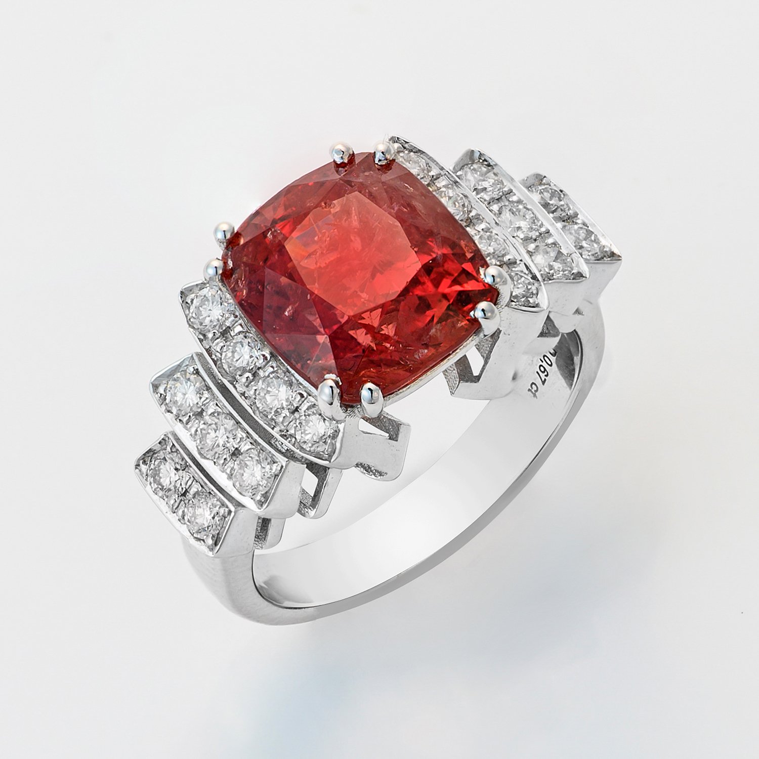 Ring set with a vivid orange spinel (no indication of treatment) of approx. 7,12 ct. and diamonds approx. 0,67 ct., in 18 k white gold. Certificate included.