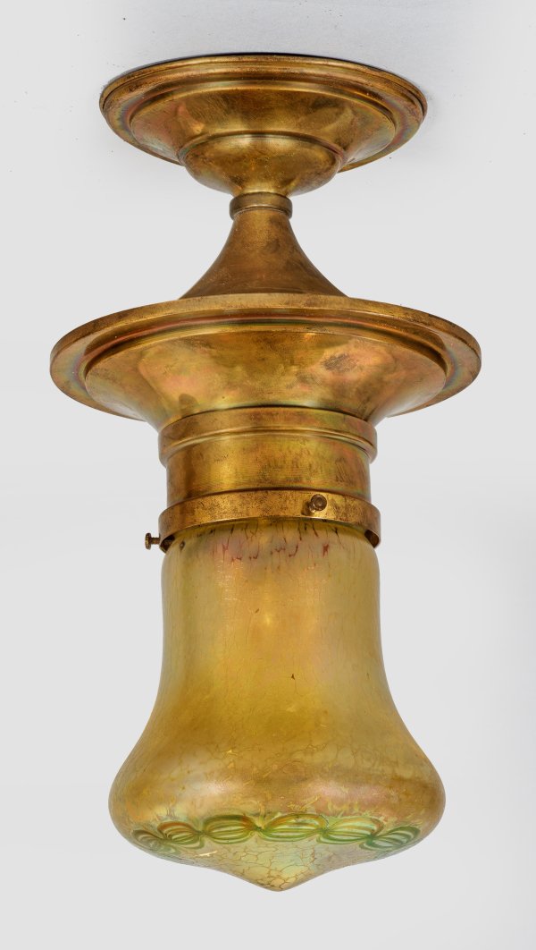 1-flg.; Messing sowie Glas mit eingeschmolzenen silbergelben Kröseln und Dekor aus eingeschmolzenen grünen Fäden, reduziert und irisiert. Balusterförmiger Korpus mit pilzförmigem Lampenschirm. Elektrifizierung erneuert. H. 31 cm.