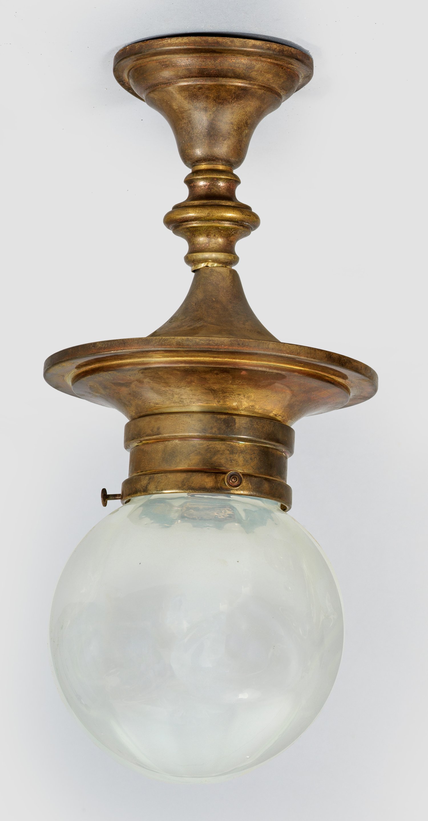 1-flg.; Messing sowie leicht irisierendes Glas. Balusterförmiger Korpus mit kugelförmigem Lampenschirm. Elektrifizierung erneuert. Messing, besch.; H. 37 cm.