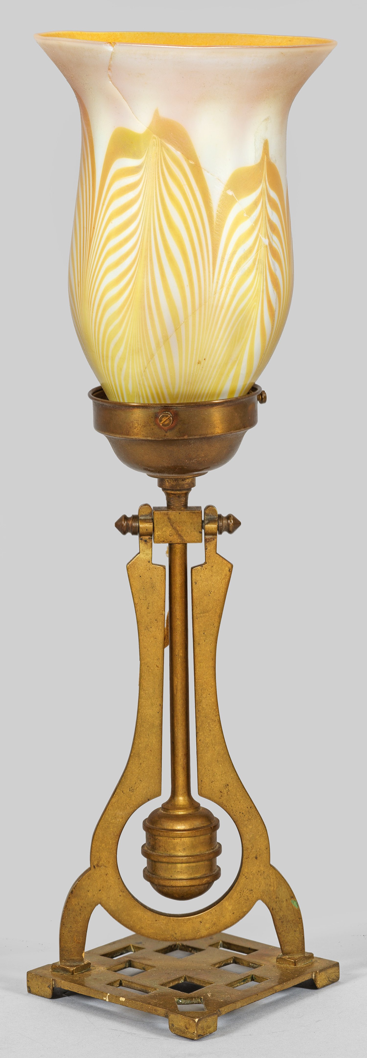 1-flg.; Messing sowie weißes, irisierend Gold hinterfangenes Glas mit korrespondierenden Einschmelzungen. Durchbrochen gearbeitetes Wandschild mit gebogten Streben als Träger für schwenkbares Leuchtmittel und kelchförmigen Lampenschirm. Elektrifiziert. Lampenschirm besch.; H. 35 cm.