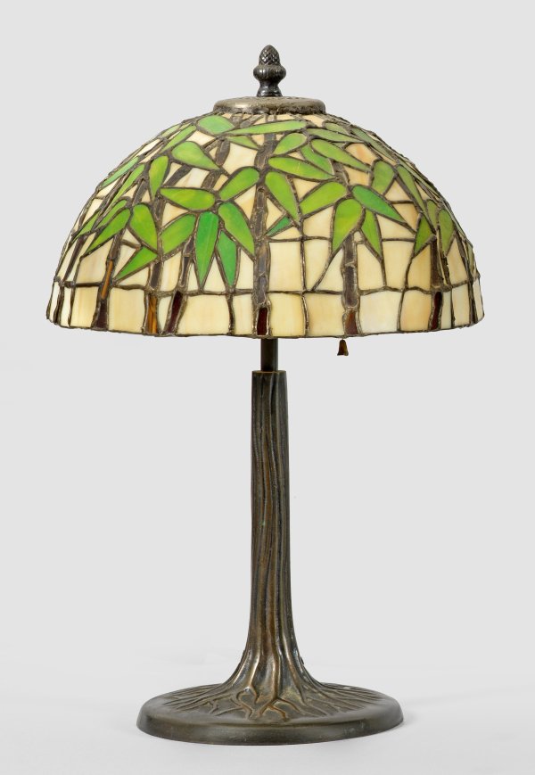2-flg.; Bronze, patiniert sowie weißes und grünes Glas. Über geschweift ansteigendem Rundfuß mit Wurzelmotiven naturalistisch gestalteter Schaft als Träger für Leichtmittel und kuppelförmigen Lampenschirm mit Bambus-Dekor. Elektrifiziert. Unbez.; H. 50 cm.