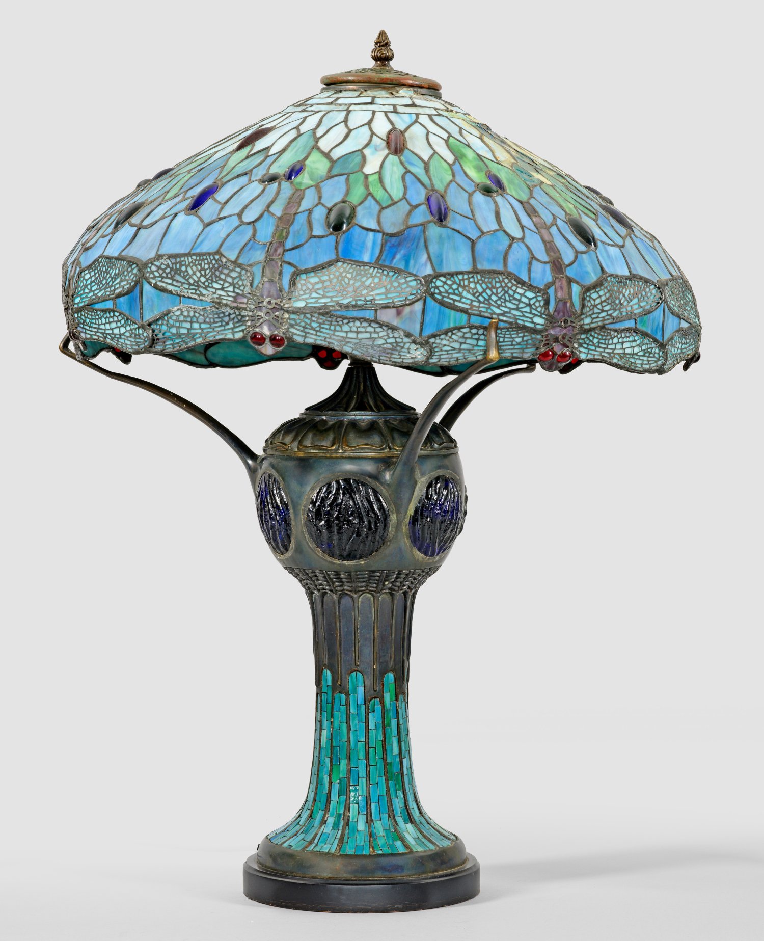2-flg.; Messing, patiniert sowie Glas in unterschiedlichen Grün- und Blautönen. Kräftiger balusterförmiger Korpus als Träger für Leuchtmittel sowie gewölbten Lampenschirm mit umlaufendem Libellendekor. Besch. und rep.; Elektrifiziert. H. 70 cm.