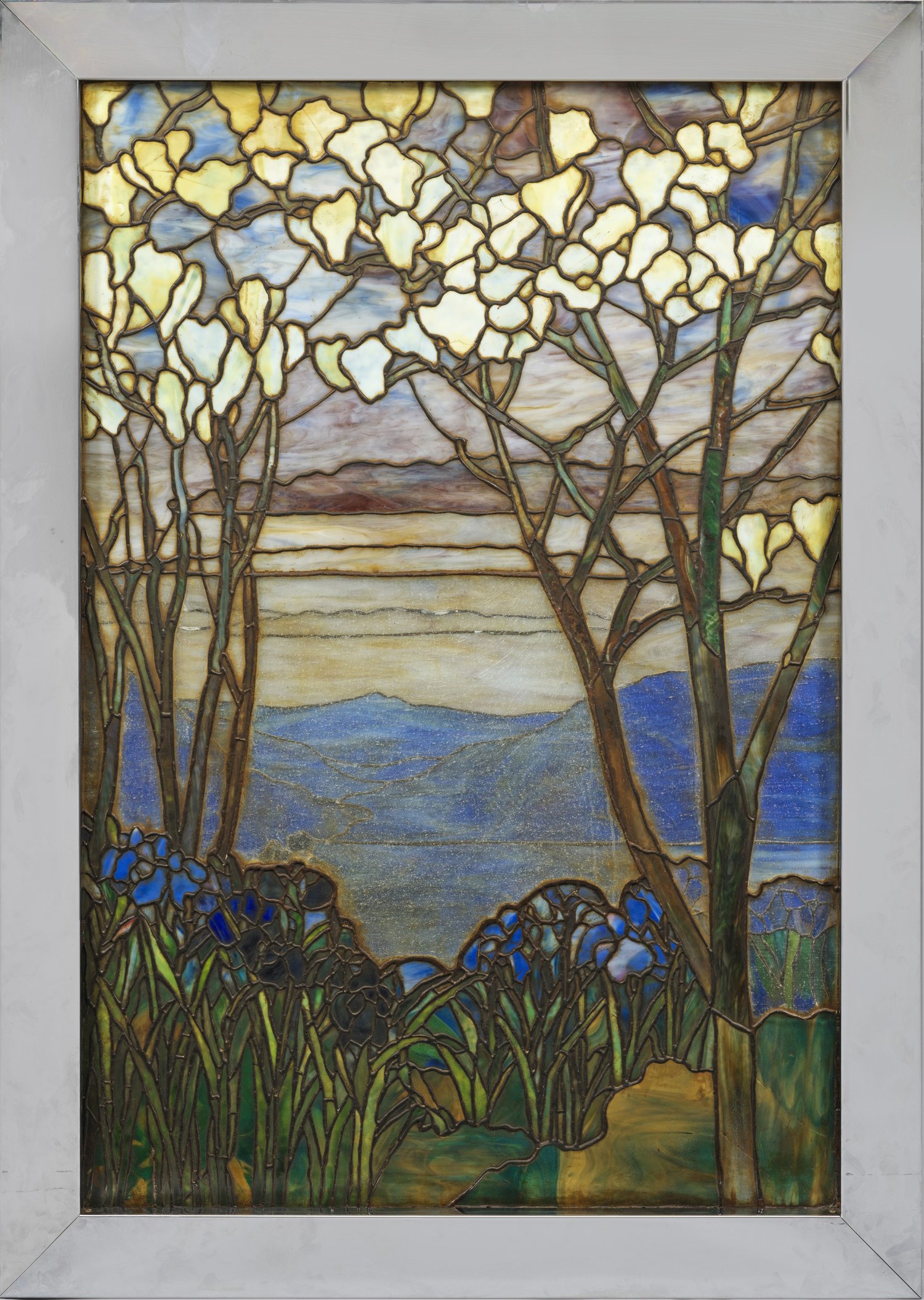 Rechteckige Form. Bleigefasstes, marmoriertes Glas in unterschiedlichen Farbtönen. Blick vom baumbestandenen Ufer mit Schwertlilien und Magnolien, auf einen See mit Bergpanorama. Holzrahmen mit Chromverkleidung. Partiell ger. Risse. Sichtmaß 131 cm x 89 cm. Ges.-H. 150 cm x 107,5 cm.