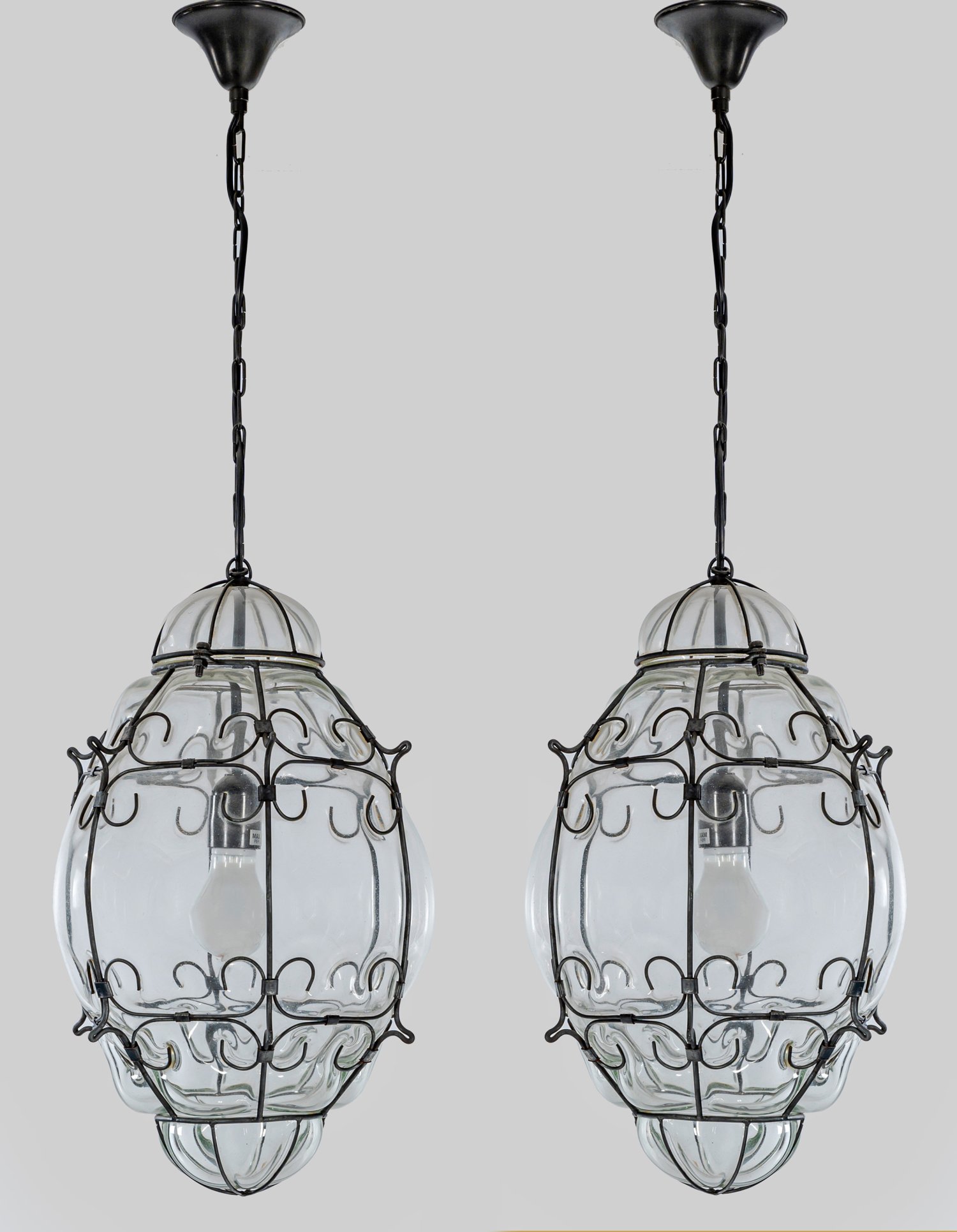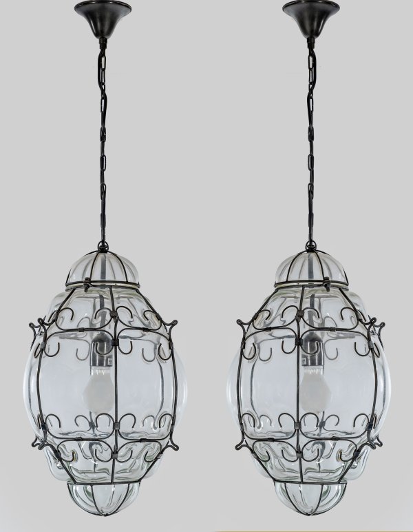 1-flg.; Farbloses Glas und patiniertes Metall. Balusterförmiger Korpus, umspannt von schmalen, teilw. volutenförmig angelegten Rundstäben. Dazu Kettenaufhängung. Elektrifiziert. Lampen-H. 46 cm. D. 28 cm.