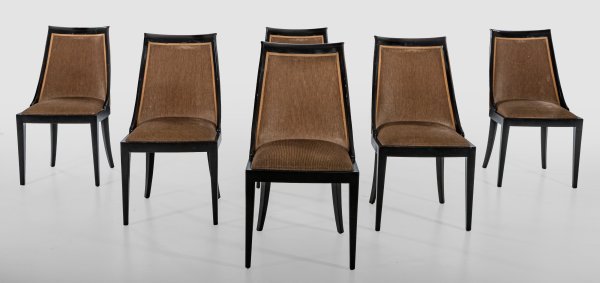 Holz, schwarz lackiert. Bombierte Zarge auf konischen Vierkantbeinen. Leicht gewölbte, sich konisch verjüngende Rückenlehnenrahmung. Gepolstert und bezogen. Sitz-H. 48 cm.