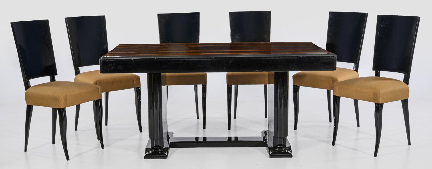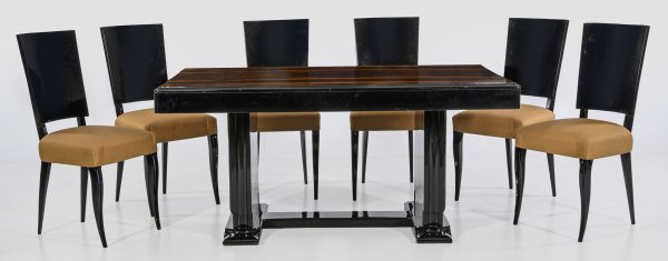 7-tlg.; Holz, schwarz glänzend lackiert sowie Santospalisander, furniert. Über flach geschweiften Stufen, gekantete Seitenwangen als Träger für gerade Zarge und umlaufend profilierte Deckplatte. Trapezförmige Zarge auf geschweiften Beinen sowie hohe, rechteckige, leicht gewölbte Rückenlehnen. Sitzfläche gepolstert und bezogen. Rest.; Tisch-H. 74 cm. 160 cm x 100 cm. Sitz-H. 49 cm.