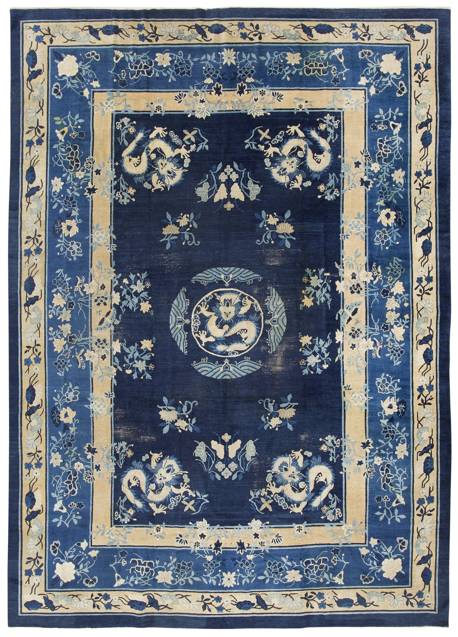 China. Um 1900. Wolle auf Baumwolle. Im dunkelblauen Innenfeld Zentralmedaillon mit fünfklauigem Drachen sowie entsprechende Ecklösungen und gestreute Blüten. Umlaufend hellblaue Bordüre mit Rankenwerk, flankiert von hellgelben Bändern. Stark belaufen. 420 cm x 315 cm.
