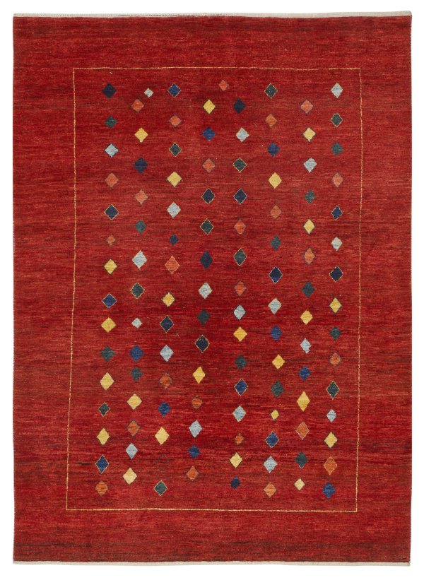 Persien. Wolle auf Baumwolle. Auf rotem, abraschierten Fond schmal gerahmtes Innenfeld mit lose gemusterten Rautenmotiven im Rapport. 140 cm x 190 cm.