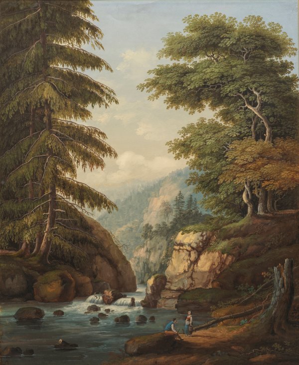 Reizvolle, subtil und fein nuanciert ausgeführte Harzimpression des Hannoveraner Malers, der ab 1833 als Hoftheatermaler ebenda tätig war und 1842 Mitglied im Hannoverschen Künstlerverein wurde. Gouache/Papier oder Karton. R. u. sign.; Mittig unterhalb betitelt. Verso von fremder Hand bez. mit Ortsangabe/Titel. 72,5 cm x 55,7 cm (Passepartoutausschnitt). Rahmen.