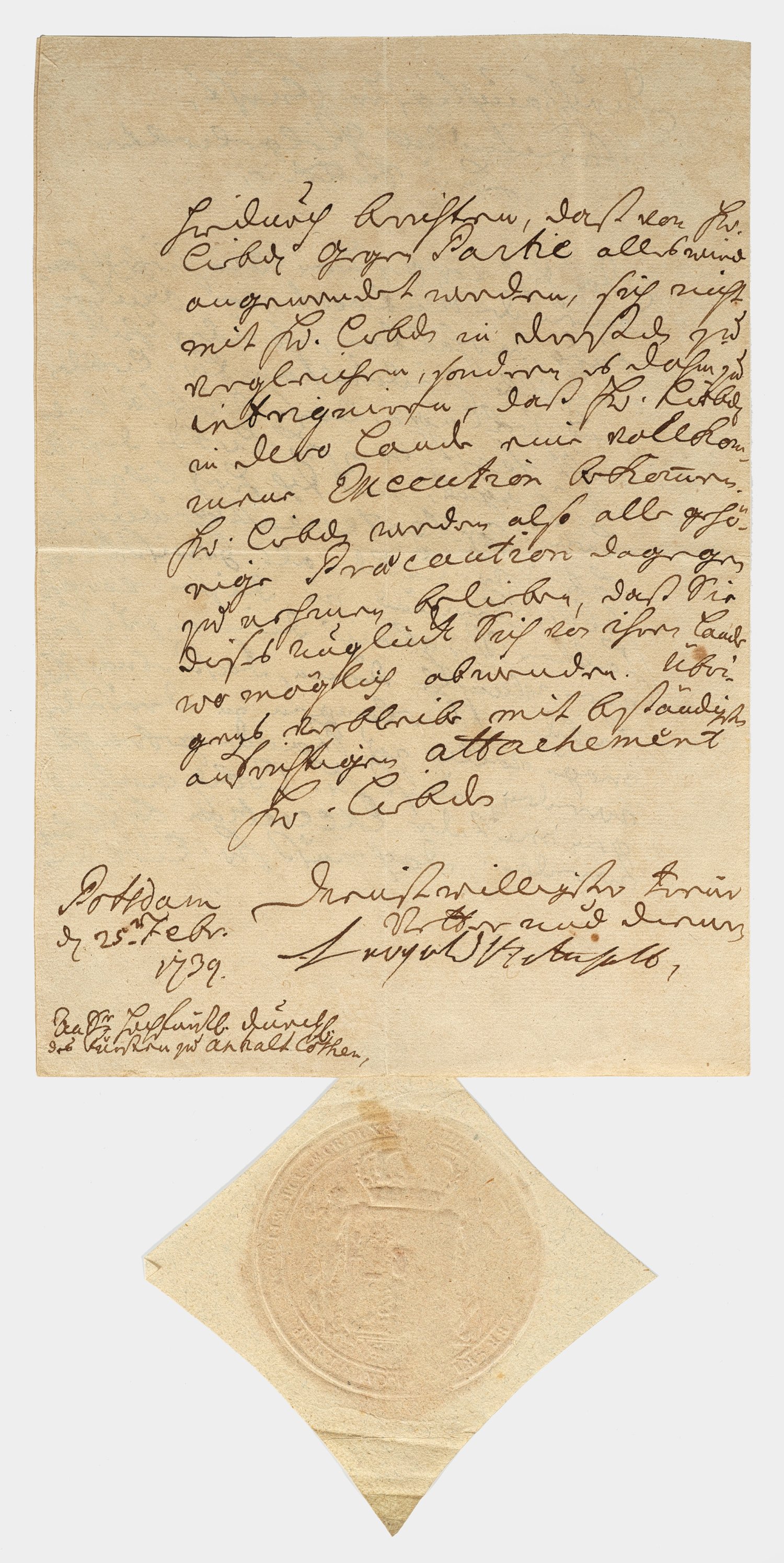 Letter by Leopold I of Anhalt-Dessau to Augustus Louis of Anhalt-Köthen, signed and dated 1739. Seal imprinted paper. Minor signs of age.
