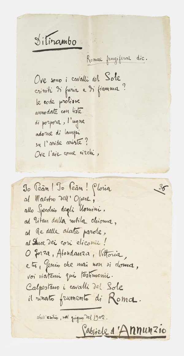 Tinte auf Papier. 36-seitig, einseitig handschriftlich geschrieben, betitelt “Ditirambo” sign. und dat. "Giugno 1902". 23 cm x 23 cm.