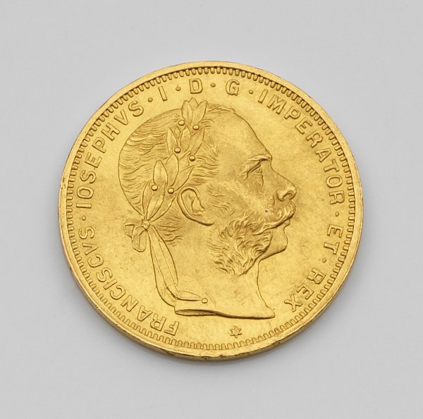 Coin "Austria, 8 florins/20 francs, 1892" in 21,6 k gold. Re-minting.