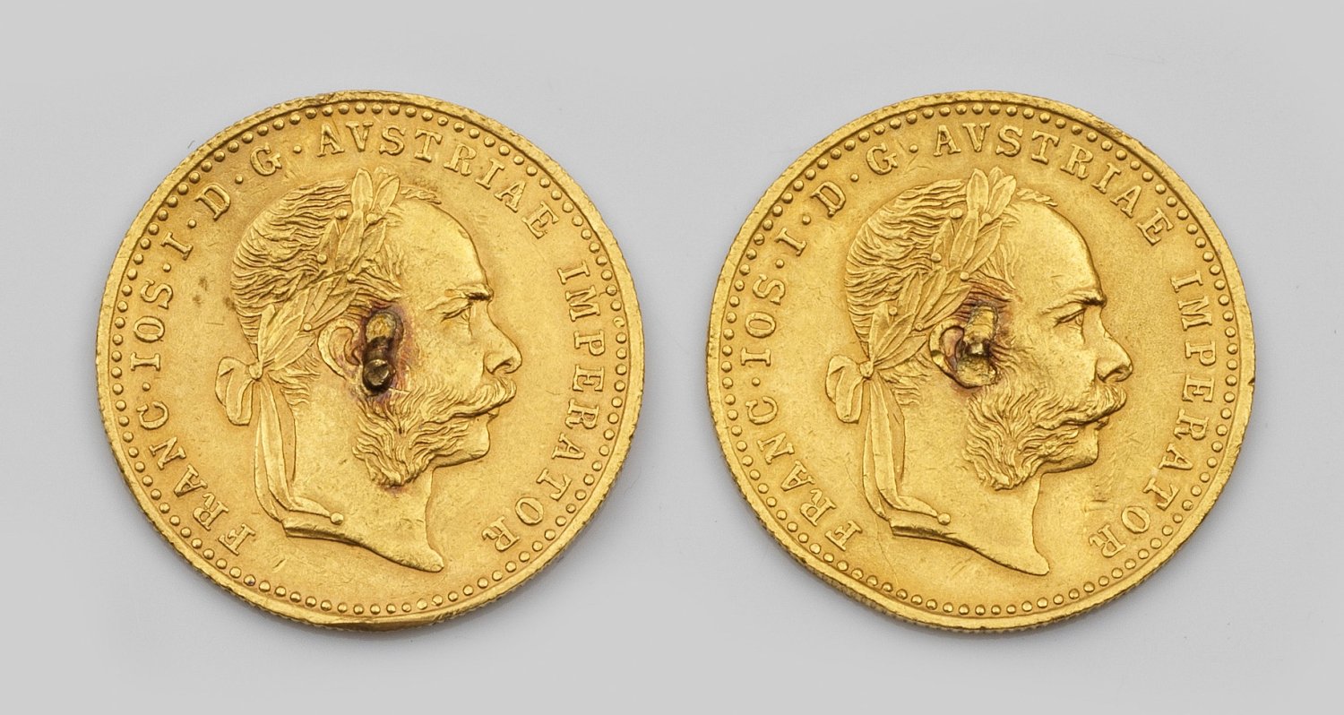 Two coins "Austria 1 ducate Franz Joseph I. 1915" in 23,6 k gold. Re-minting. Damaged.