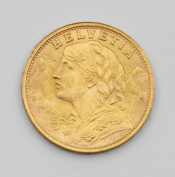 Feingehalt 900. Sog. "Schweizer Goldvreneli". Avers Profilbild einer jungen Frau mit Haarkranz vor einem Alpenpanorama (Entwurf von Fritz Ulysse Landry). Revers Schweizer Wappen mit Eichenzweigen, Nominal, Jahreszahl 1947 und Prägebuchstabe B. D. 21 mm. Gew. ca. 6,48 g.