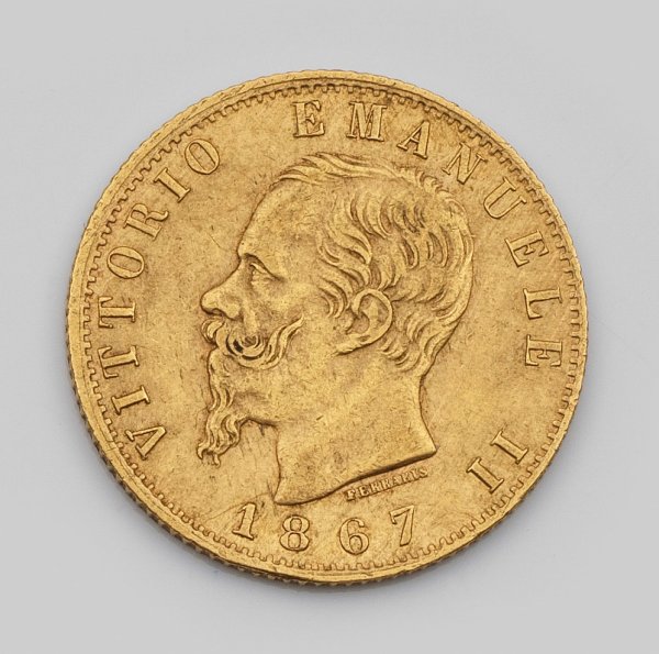 Coin "Italy 20 lire Vittorio Emanuelle 1867" in 21,6 k gold.